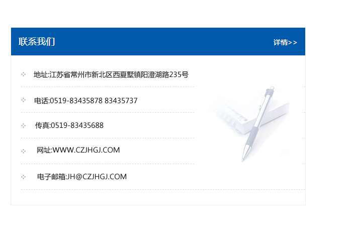 地址:常州市新北區友邦商務大廈1幢16、17層  電話:0519-85101652  傳真:0519-85112595  郵編:213022  網址:www_cz-jiayue_cn.jszhenzhuyan.com  郵箱:xiajifengaa@163.com